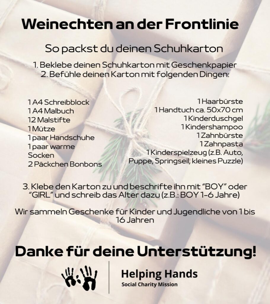 Wir freuen uns sehr über deine Beteiligung an dem Projekt. Packe gerne einen oder mehrere Schuhkartons und sende diese/n über uns an die Kriegskinder in der Ukraine. Die Packliste findest du unten im Flyer.